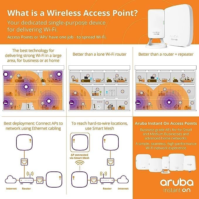 The Aruba Instant On AP22 Access Point is the perfect solution for small businesses looking to upgrade their wireless network with secure, ultra-high-speed Wi-Fi 6. Its simple setup, Smart Mesh technology, and reliable performance make it a go-to choice for professionals and homeowners alike.